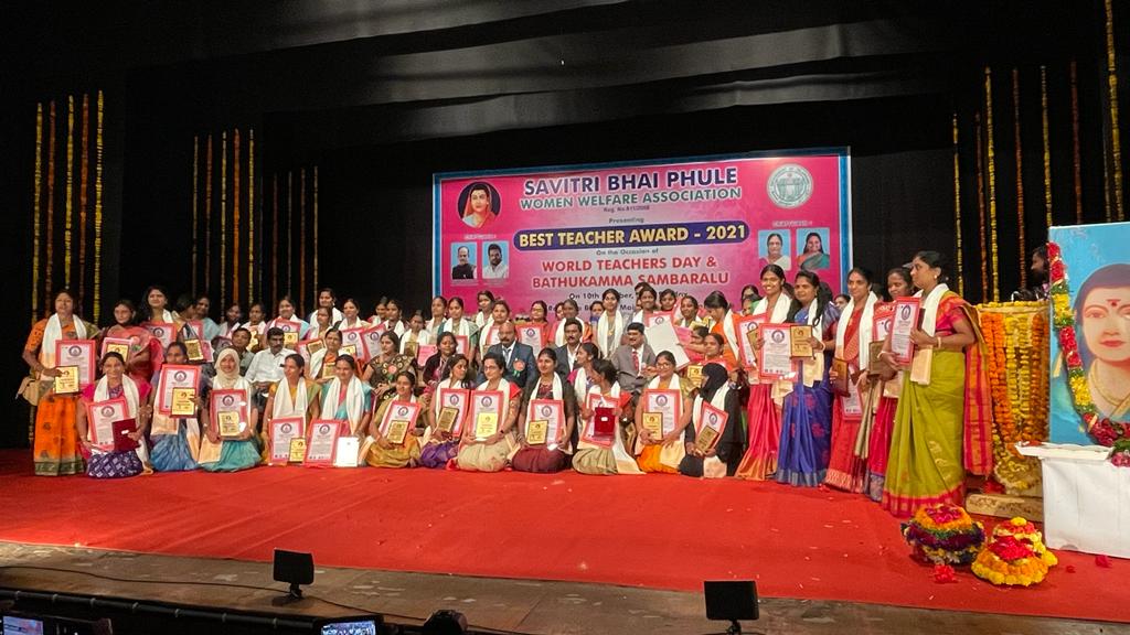 On the occasion of World Teachers’ Day Celebrations Savitri Bhai Pule Women Welfare Association, Hyderabad, Telangana State, India has presented Best Teacher – 2021 Award and Felicited to 100 working Governement Women Teachers and Professors on a single stage on10th October 2021 at Ravindrabharati, Hyderabad.This program was held in the supervision of Smt. Bellam Mahadevi, Founder of Savitri Bhai Pule Association.T.S.