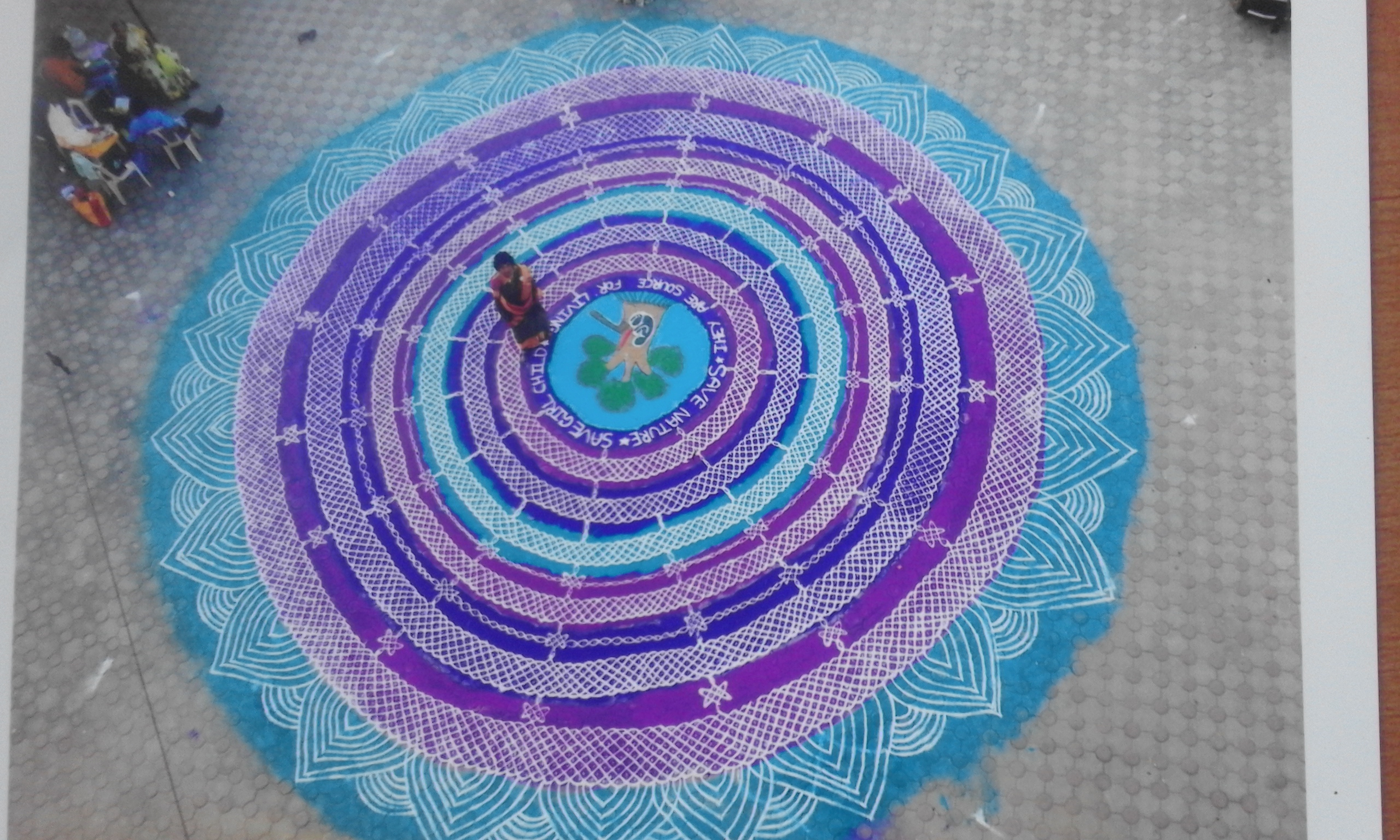 Smt. Savitha. S.M. W/o S. Muralidhar ( Age 46) from Chittoor, Andhra Pradesh, India has created a new national record in making rangoli. She was made rangoli ( Rangavalli) on concept of ‘Save Girl and Save Trees’, its measuring 40×40( 1600 Sq.ft) with 10,000 dots in duration of 8 hours. this event was held on 10th Feb, 2018, at Chittoor, from 8:00 Am to 4:00 Pm, made the rangoli in which about 35 kgs muggu powder, 40 kgs rangoli colors in shades. This creative dots rangoli has been placed in Telugu Book of Records.