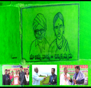 Sri. Nagula Chinna Gangaram, Former S/o Late Muthenna, and Late Smt. (Born On 15th January 1954) from Nizamabad, Telangana, India. He cultivated paddy crops portrait of his parents on his agricultural land. For this portrait, he was sown different types of paddy like … Pancharatna, Bangaru Gulabi, Chintalure, and Sannalu for the formation of a mega paddy crops portrait of his parents. Images measured in 160 feet width and 260 feet in height. The Paddy crop was sown on 26-06-2022 and transplanted on 22-07-2022. This mega paddy crop image signification his love and affection for his parents. This rare cropping has been appreciated by the Telugu Book of Records in a special category.