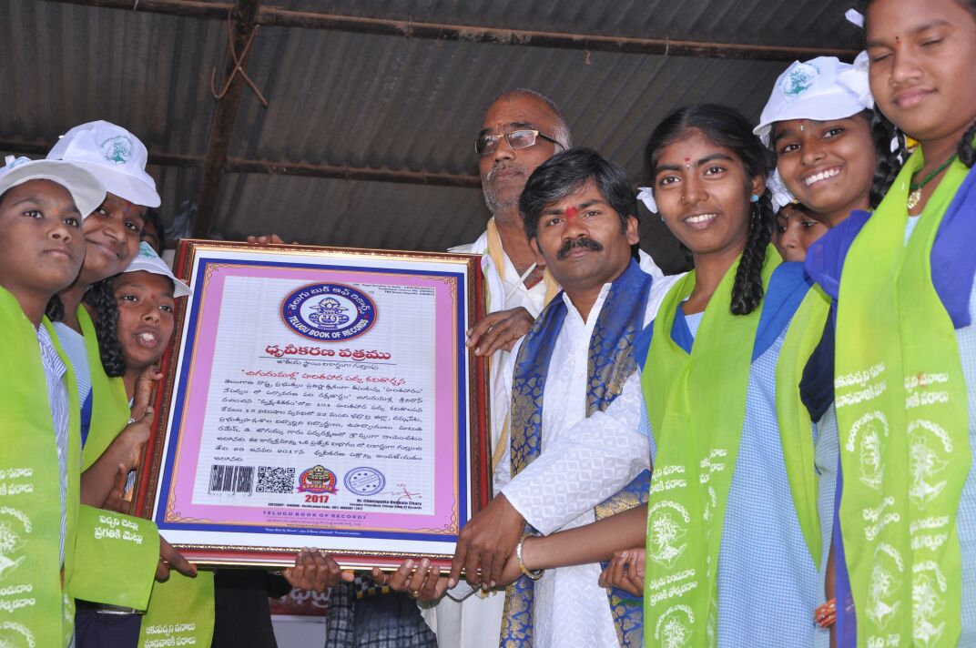 Mr. Chigurumalla SrinivasĀ from Bhadradri Dist. Telangana State, India was wrote his poetry ‘ VRUKSHA SATAKAM’ on Trees consisit of 100 poems. These 100 poems sung by 22 school students within 15 minutes in supervisoin of Sri Mamidi Ramesh and D. Jogaiah. On 28th january 2017 at Dammaipeta Governament School, Bhadradri Dist.