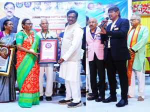 This is to certify that “Janani–Tanaya Nritya Vaibhavam” – Kuchipudi Brunda Nrutyam on the official Telangana State Song “Jaya Jayahe Telangana” penned by Dr. Ande Sri, was magnificently performed by a total of 108 pairs of Mothers & Daughters and Students on 13th September 2025 at Mancherial, under the esteemed guidance of Dr. Chidananda Kumari, Kuchipudi Natya Guru, and organized by CSNEHA Foundation with the support of KV Pratap, Chairman, Mancherial. This grand cultural presentation has set a record for the largest group Kuchipudi performance honoring Telangana Statehood involving mother–daughter pairs, and is hereby recognized and honored by the Telugu Book of Records.