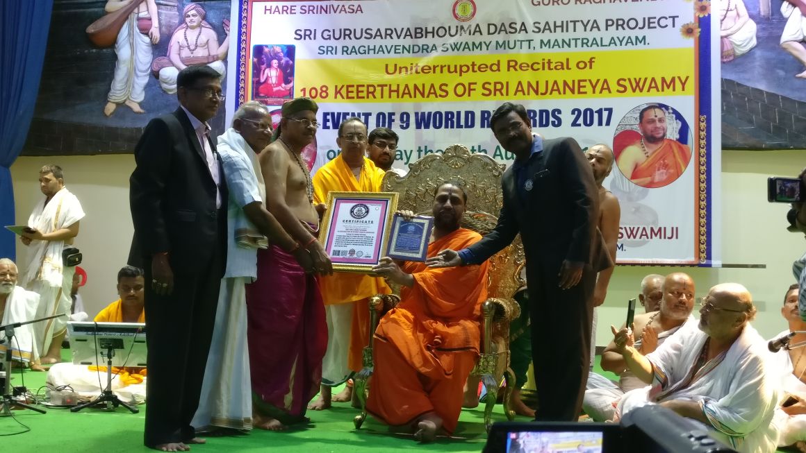 Sri.Parayatam Narayana Charyulu S/o Sri Parayatam Vijaya Charyulu of Andhrapradesh, India has organized a spiritual event of ‘Bhakti Sangeetha Keerthanaalapana’ 108 Sri Anjaneya Swamy Keerthans were sung by 2500 female participants in single venue. This Keerthanas 200 to 600 years back wrote by Karnataka Haridas’s, six states with six different linguistic backgrounds. This event was held on 20th August 2017, at Mantralayam Temple premises. This event has been placed in Telugu Book of Records.