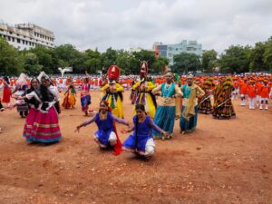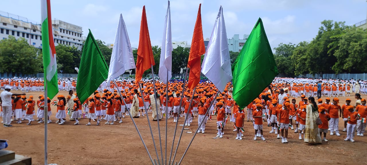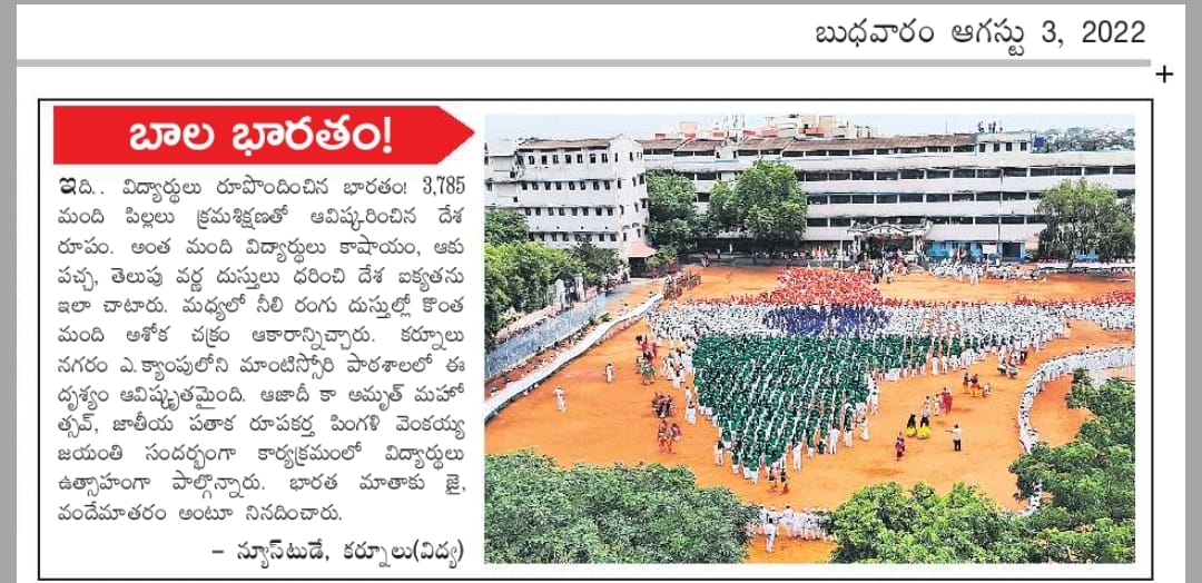 * Every Montessorian will salute the National flag and state “Mera Bharat Mahan & Jai Hind”. This individual act of every student will be shot and all the videos were uploaded on social media. These patriotic, as well as social awareness pursuits, are going to be conducted at the school premises on August 2, 2022. This event will be held under the supervision of Mrs. P. NAGA LAKSHMI on a single day and has been approved by the Telugu Book of Records in the special category of mass attempt.