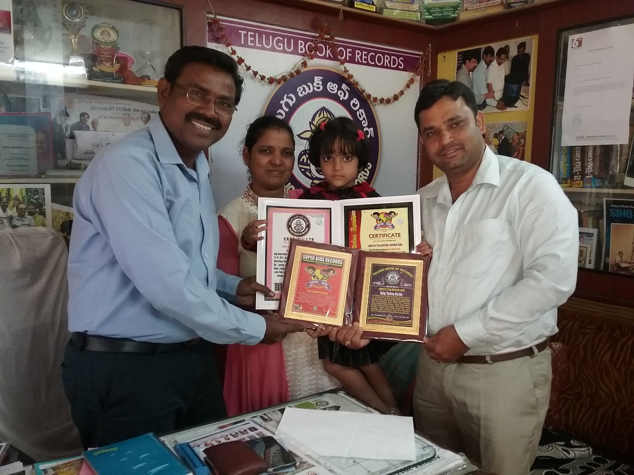 Baby Yashna Baride D/o Sudheer Kumar Baride and Rashmi Baride ( Born on 13-10-2013 ) from M.N.Reddy Nagar, Quthbullapur Mandal, Suchitra, Dist. Ranga Reddy, Telangana State, India has performed multi talents like… painting, drawing, multi language singing ( Telugu, Hindi, English, Marati), skating, dancing, acting, story telling, fashion dressing, making crafts, Violin bowing etc…were performed within 100 minutes held on 14th November 2017, at Telugu Book of Records office, Secunderabad.