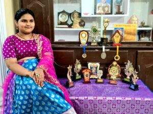 from Kurnool. Andhra Pradesh, India has performed multiple talents like… classical, folk, western dance, classical music singing ( lite music) Mime show, modeling, and ethnic modeling. acting drawing, crafts work, sand art. karate (Blue Belt). cricket, speech, cooking. essay writing, model making, Bhagavatha slokas. Telugu poems, storytelling. Ventriloquism and many more skills have been appreciated by the Telugu Book of Records in the Kids category.