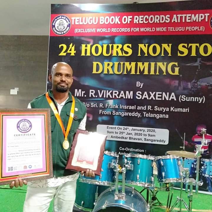Mr. R. Vikram Saxena S/o R. Frank Israel and Smt. R. Surya Kumari ( born on 14th March 1987) from Sangareddy, Telangana State, India has created a rare achievement of nonstop 24 hours drumming. In this event, he has performed different types of drumming styles in an orchestra while singing Telugu and Hindi cinema songs and folk songs by singer. This event was held on 24th and 25th January 2020. The venue at Dr.B.R. Ambedkar Bhavan, Sangareddy.