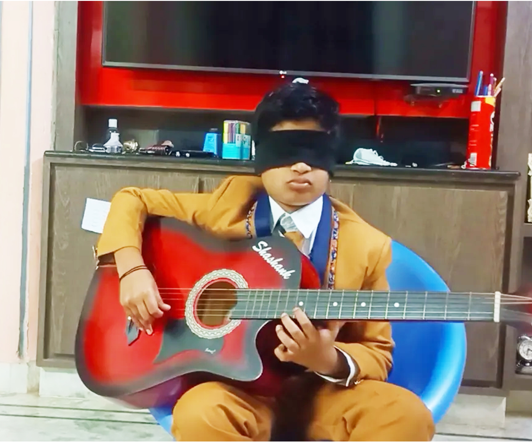 Master Medidi Shashank S/o Mr. M Harinatha and Smt. Naga Laxmi (born on 27-08-2010) from Khammam, Telangana State, India has played non-stop 10 songs continuously on the Guitar while blindfolded. This kind of blindfolded Guitar playing has been appreciated by the Telugu Book of Records in the Kids category.