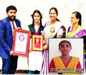 Kum. Chidharla Varshini D/O Sri. Ch. Sudhakar and Smt. Ch. Veena, (born on 10th October 2008) from Arepally Village, Warangal District, Telangana State, India. She is studying in the 8th class in Sri Chaitanya High School, Warangal has recited Periodic table, Telugu Poems, and G.K questions in less duration. This memory activity is trained by Mr. K. Raghu Founder of Education Through Music Institute, Warangal has been appreciated by the Telugu Book of Records in the Kids category.