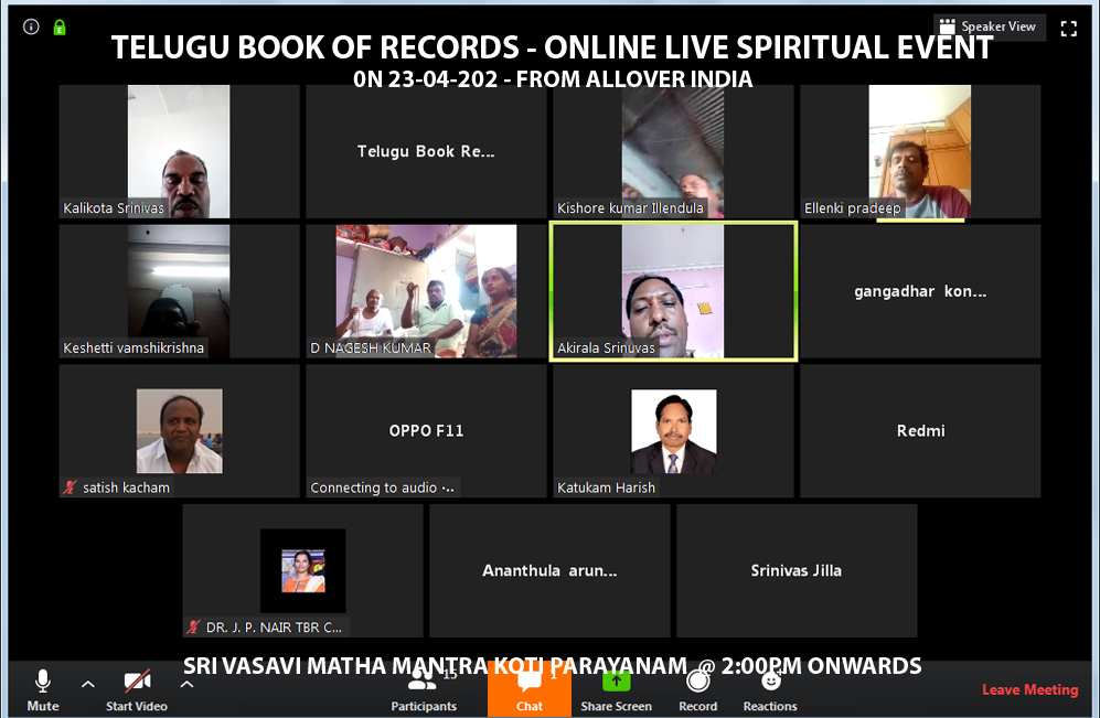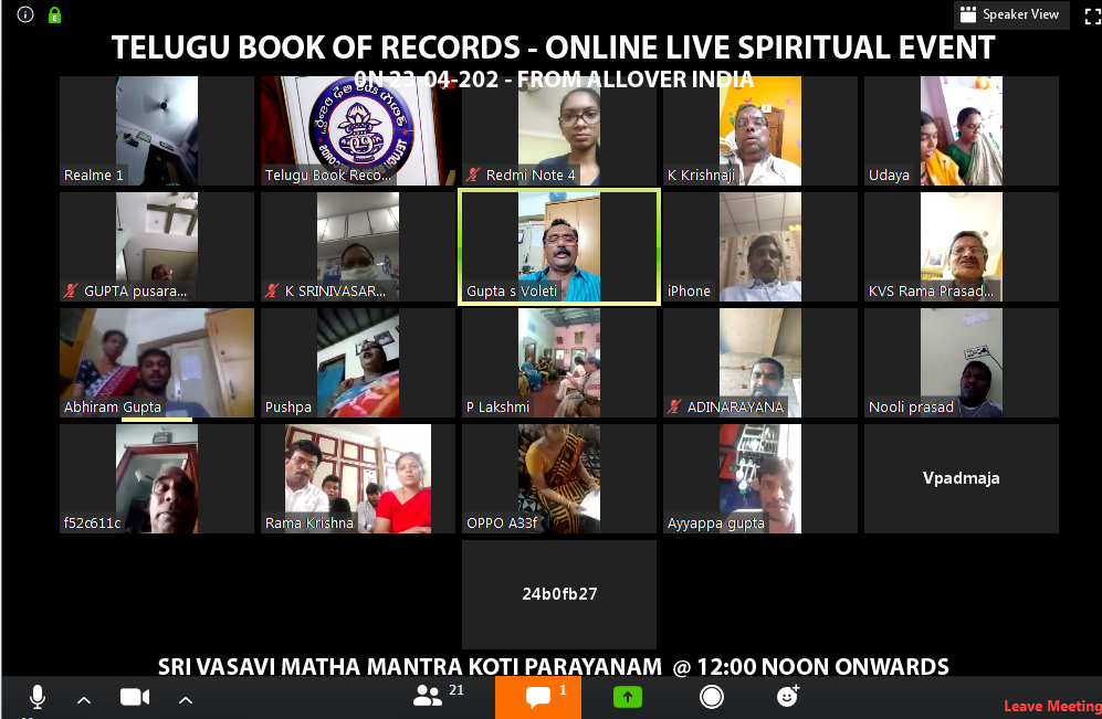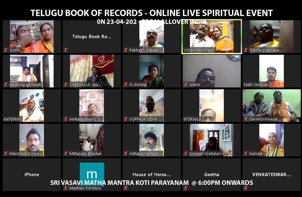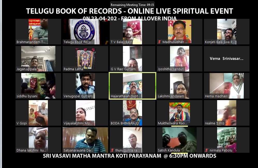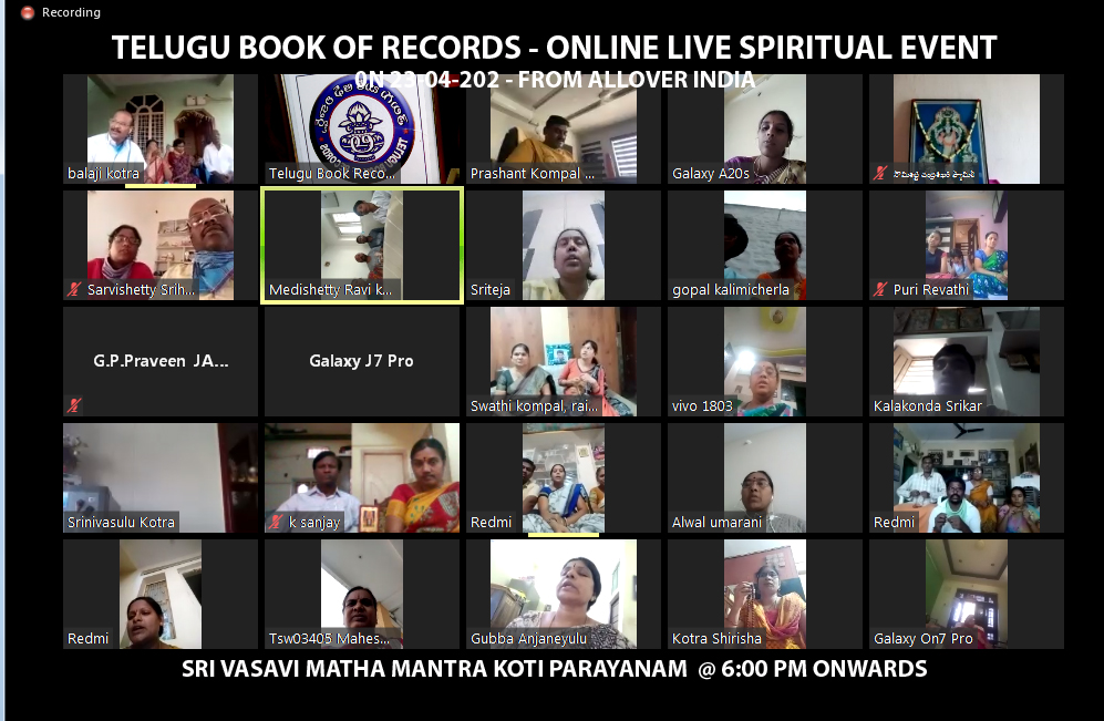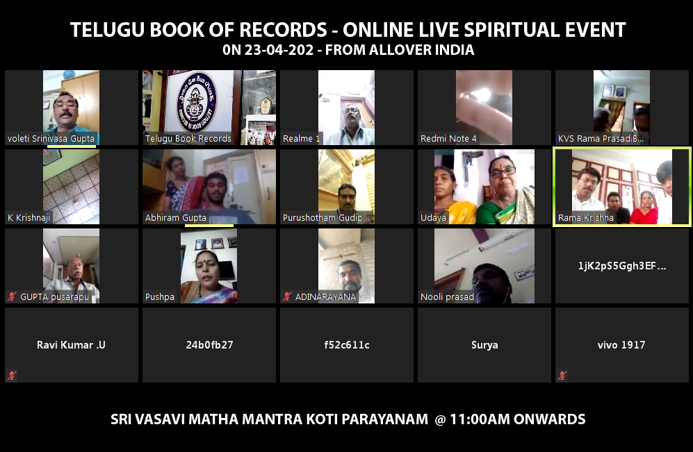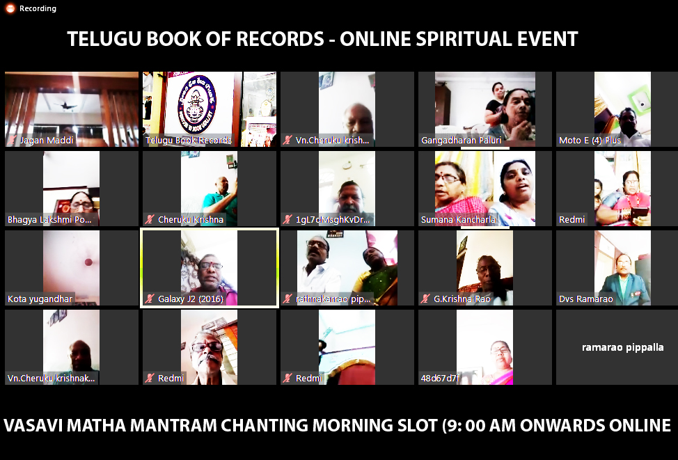 Vasavi Clubs International Hyderabad has successfully organized a spiritual event of ‘VASAVI GAYATHRI MANTRAM’ chanting for 2,17,78,060 times by Vasai Club members in multiple locations through online from all over India by using Zoom App. This rare spiritual event was held on 23rd April 2020 from 9:00 AM to 9:00 PM. This spiritual event has been recognized by Telugu Book of Records in a special category.